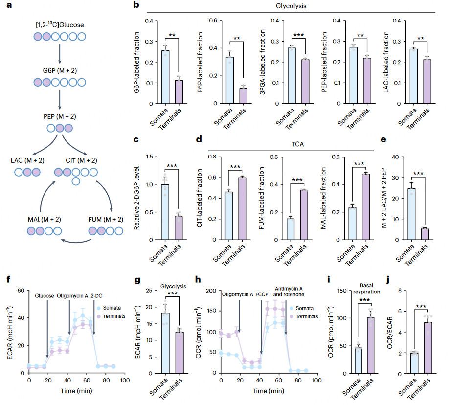 欧意交易所,欧意,欧意交易平台,欧意注册,欧意靠谱吗,欧意APP下载,欧易交易所官网,欧易下载,欧易下载链接,欧易apk下载,欧易网页版,欧易交易所,欧易下载,欧易官网,okx官网,欧易客户端下载作者培养分离出的神经元胞体和突触体,用质谱检测同位素标记的葡萄糖代谢中间产物(图1a)。发现神经元胞体的葡萄糖摄取和糖酵解通量高于神经末梢(图1b-c)。神经元突触中柠檬酸、富马酸和苹果酸的同位素标记比例明显高于神经元胞体(图1d)。用乳酸盐与PEP的比率表示有氧糖酵解的相对通量,神经元胞体中乳酸与PEP的比率较高(图1e)。作者使用Seahorse XF分析仪进一步验证了神经元胞体和突触之间的代谢差异。细胞外酸化率(ECAR)和耗氧量(OCR)显示,神经末梢比神经元胞体消耗更多的氧,产生更少的乳酸(图1f-j)。结果表明,与神经末梢相比,胞体进行更多的有氧糖酵解,而较少进行氧化磷酸化。