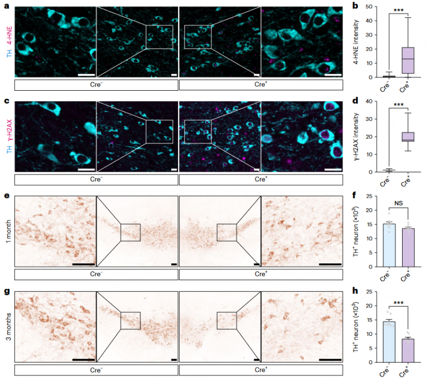 有氧糖酵解不产生活性氧,这有助于避免氧化损伤。空间代谢组学结果显示,PKM2缺失后,抗氧化剂、还原型谷胱甘肽和还原型抗坏血酸明显减少(图4j,k),表明神经元胞体葡萄糖代谢的改变损害了神经元的氧化还原缓冲能力。作者推测神经元胞体进行高有氧糖酵解以防止氧化损伤。神经元胞体葡萄糖代谢从有氧糖酵解转向氧化磷酸化导致大脑皮层神经元脂质氧化损伤增加,而核酸氧化没有显著变化。在多巴胺能神经元中,神经元胞体葡萄糖代谢转换后,脂质和核酸氧化损伤都增加了(图5a-d)。不同脑区的神经元胞体葡萄糖代谢改变可导致神经元氧化损伤,这表明神经元胞体利用高水平有氧糖酵解来防止氧化损伤。