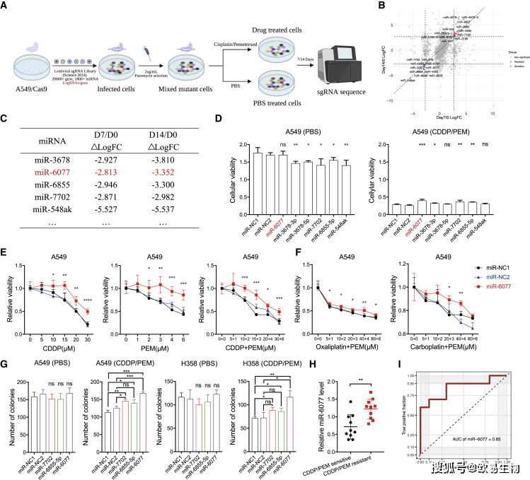 欧意交易所,欧意,欧意交易平台,欧意注册,欧意靠谱吗,欧意APP下载,欧易交易所官网,欧易下载,欧易下载链接,欧易apk下载,欧易网页版,欧易交易所,欧易下载,欧易官网,okx官网,欧易客户端下载(1)为了深入了解可能调节LUAD细胞对CDDP加PEM联合化疗敏感性的机制,作者首先进行了基因组规模的CRISPR-Cas9功能筛选试验,sgRNAs转入到A549 细胞中用PBS或者CDDP/PEM处理7 或14天后进行转录组测序测量不同基因或 miRNA被敲除的细胞群的相对丰度,评估不同组别中sgRNA的表达。共筛选出11个能够导致A549细胞对CDDP/PEM显著敏感的miRNA,其中5个候选 miRNA具有单个剪接体并且以前没有被报道过。其中miR-6077的过表达仅在CDDP/PEM存在的情况下导致细胞活力显著增加,因此表明miR-6077可能作为LUAD对CDDP /PEM化疗抗性的关键调节因子。