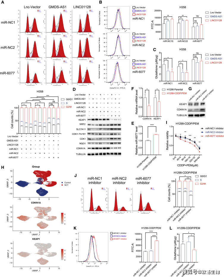 首先作者将miROFF-6077抑制剂转染到H1299-CDDP/PEM 细胞进行miR-6077敲降,发现CDKN1A 和 KEAP1 的表达上调,单细胞数据也表明与未接受新辅助化疗的细胞相比,来自CDDP/PEM治疗组的细胞群的特征是CDKN1A和KEAP1的表达更高。另外,miR-6077 敲低可以降低 H1299-CDDP/PEM 的化学抗性,并加重化疗诱导的细胞周期停滞和铁死亡,这些结果与上述结果一致,证明 miR-6077 通过直接与CDKN1A 和 KEAP1结合来调节细胞周期进程和铁死亡,从而有助于 LUAD 对 CDDP/PEM 的抗性。